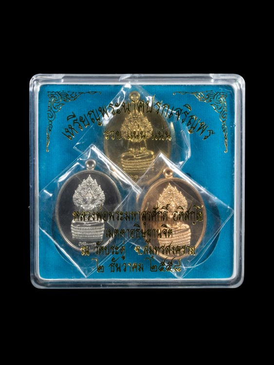 ชุดเหรียญพระนาคปรกเจริญพร รวย แน่น แน่น หลวงพ่อพระมหาสุรศักดิ์ วัดประดู่อารามหลวง จ.สมุทรสงคราม พ.ศ.2558 |