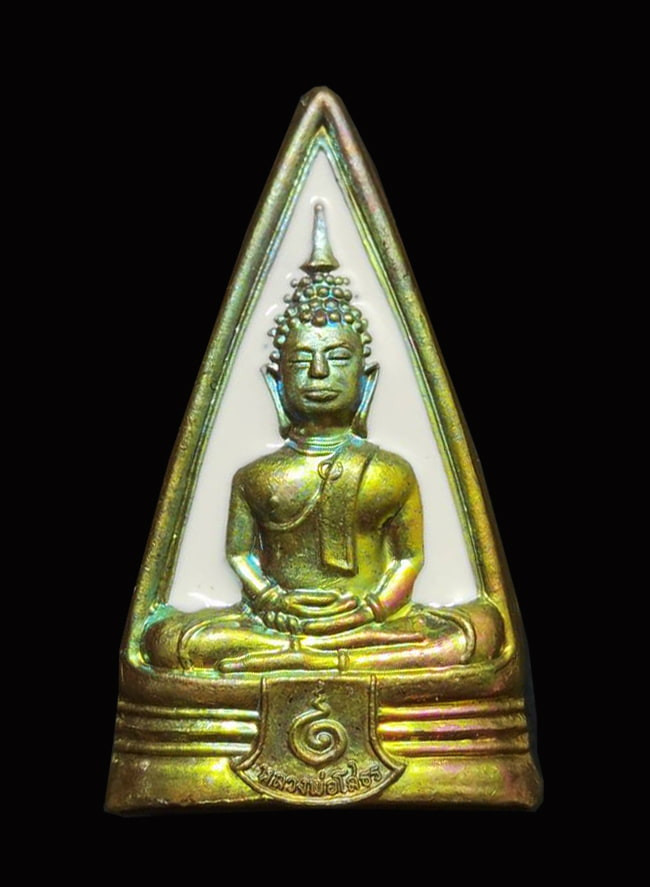 เหรียญสามเหลี่ยม หลวงพ่อโสธร หลัง ท้าวเวสสุวรรณ รุ่น พรปีใหม่ ปี2565 เนื้อทองเหลืองผิวรุ้งลงยาขาว(หมายเลข 948) |