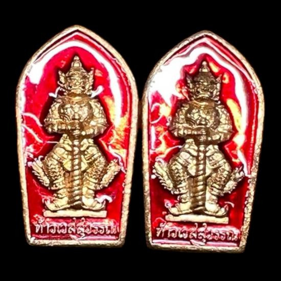 วัดใจ 100 เหรียญท้าวเวสสุวรรณ วัดจุฬามณี พิมพ์ลูกท้อ รุ่นขึ้นเหนือ ลงยาสีขาว ตอกโค้ดกรรมการ |