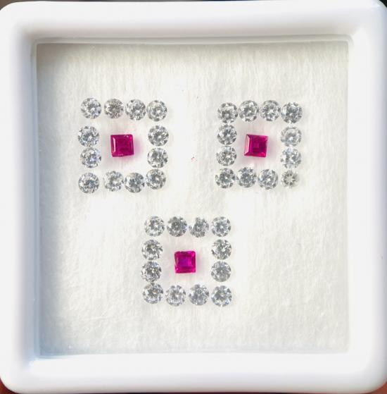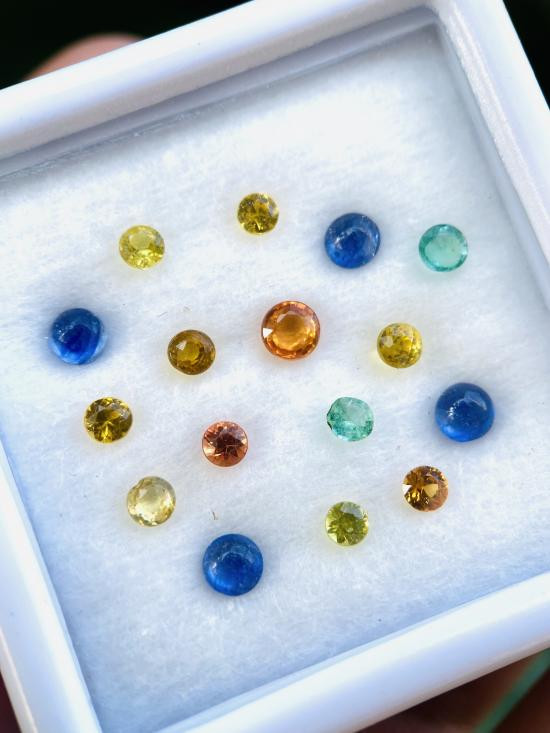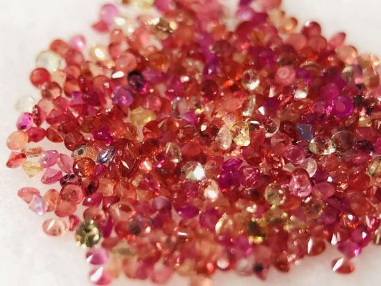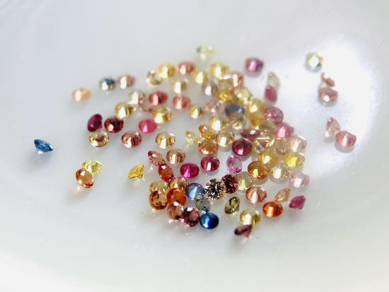 แฟนซีแซฟไฟร์ 3 กะรัต ไซส์ ขนาด 1.0 มิล (เทียบเพชรไซส์ครึ่งตัง) ~450 เม็ด ( ทับทิม ไพลิน เขียวส่อง บุษราคัม พัดพารัชชา เรดแซฟไฟร์ ออร์เรนแซฟไฟร์ กรีนแซฟไฟร์) เจียระไนเหลี่ยมเพชร |