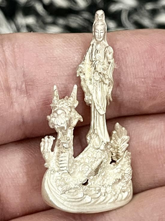 กวนอิมหล่อ เนื้อเงิน ยืนประทับมังกร สวยงาม น้ำหนัก 12.53 กรัม |