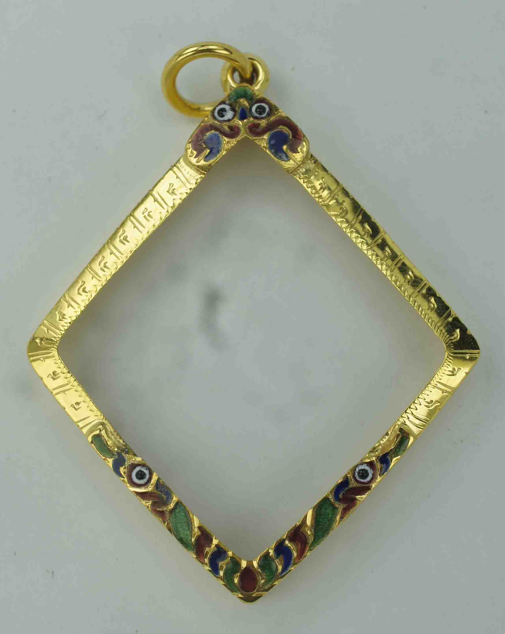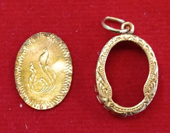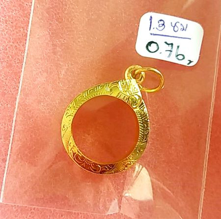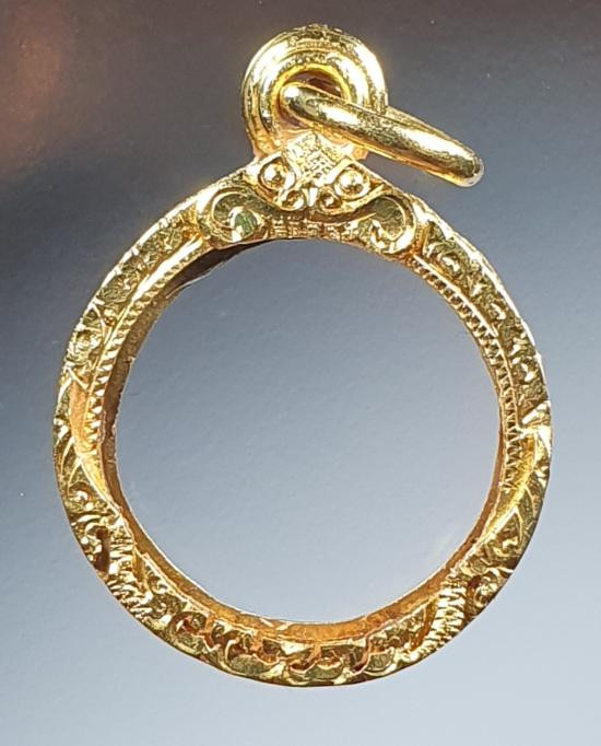 กรอบทองคำแท้ยกซุ้มสิงห์ ใส่เหรียญกลม/ลูกอม/เครื่องราง/เกจิอื่นๆจอใน1.3ซม..น้ำหนัก 0.76 กรัม |
