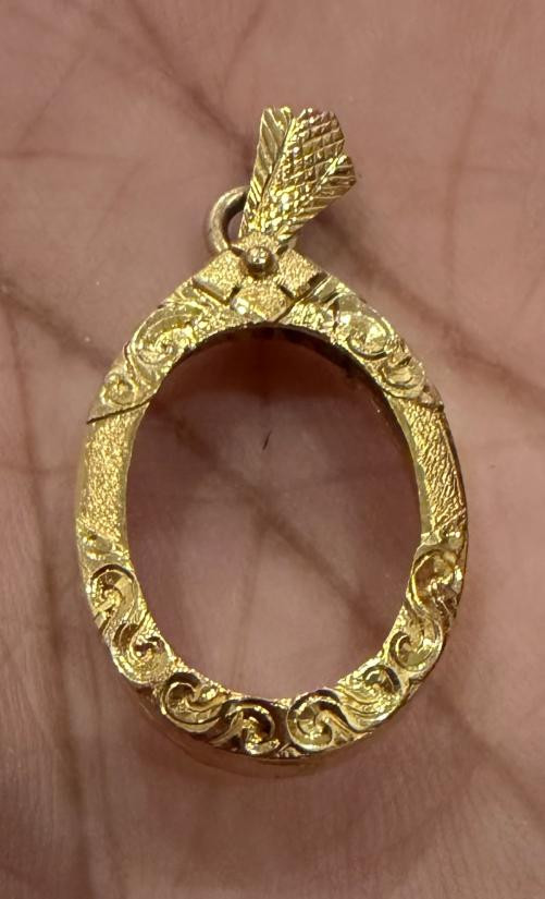 กรอบทองมือสอง ใส่พระสมเด็จยอดนิยน หรืออื่นๆทั่วไปที่ไกล้เคียง หน้าจอกว้าง 2.8 ซม., สูง 4.0 ซม. น้ำหนัก 2.81 กรัม เคาะเดียว |