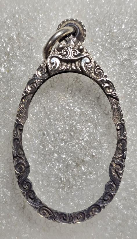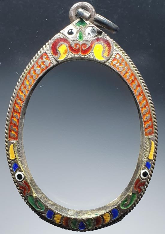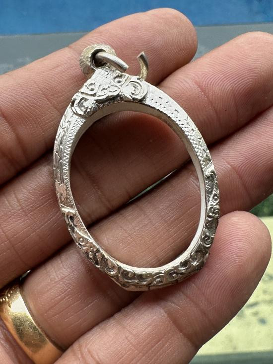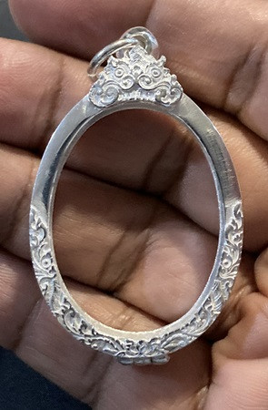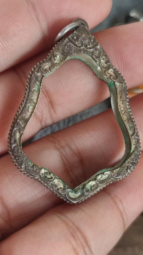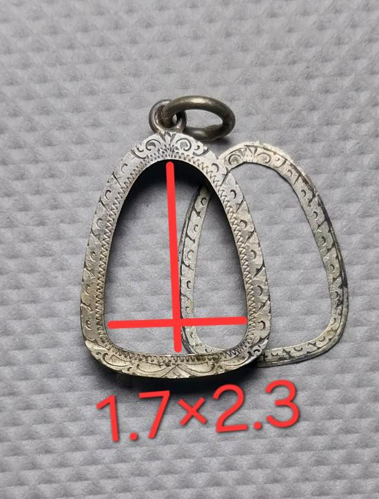 เคาะเเรก///กรอบเงิน มือสอง มือ2สภาพดีไม่มีฉีกขาด ห่วงเชื่อม ลวดลายแกะมือ ขนาด1.7×2.3 |