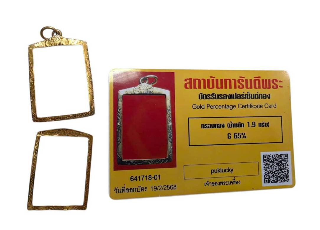 กรอบทองมือสองสภาพสวย ไม่มีฉีกไม่มีขาด น้ำหนัก1.9ก ยิงได้65% บัตรรับรองการันตรีพระ |