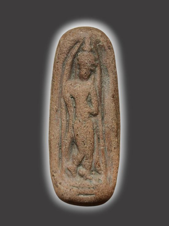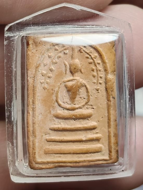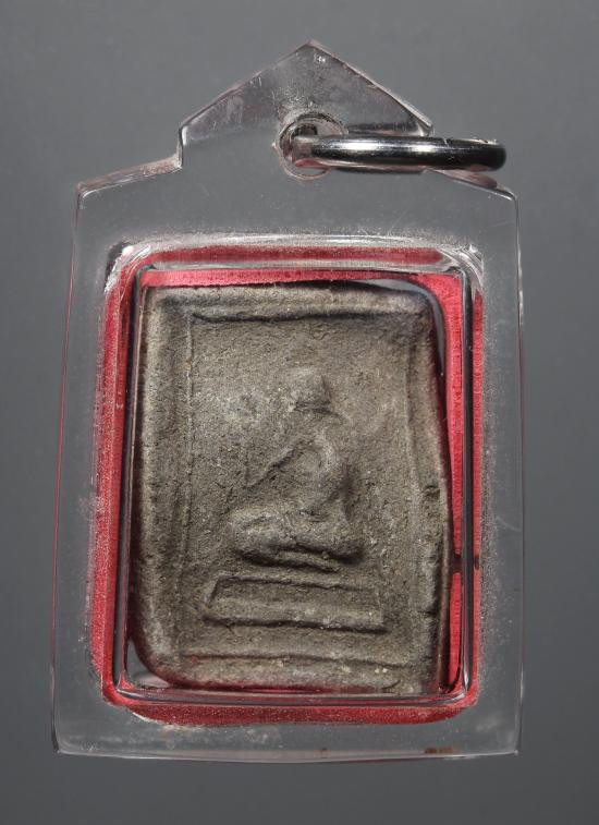 พระเนื้อดิน พิมพ์ปรกโพธิ์ หลังเรียบ เลี่ยมกันน้ำจับขอบ ขนาดประมาณพิมพ์คะแนน ไม่ทราบที่