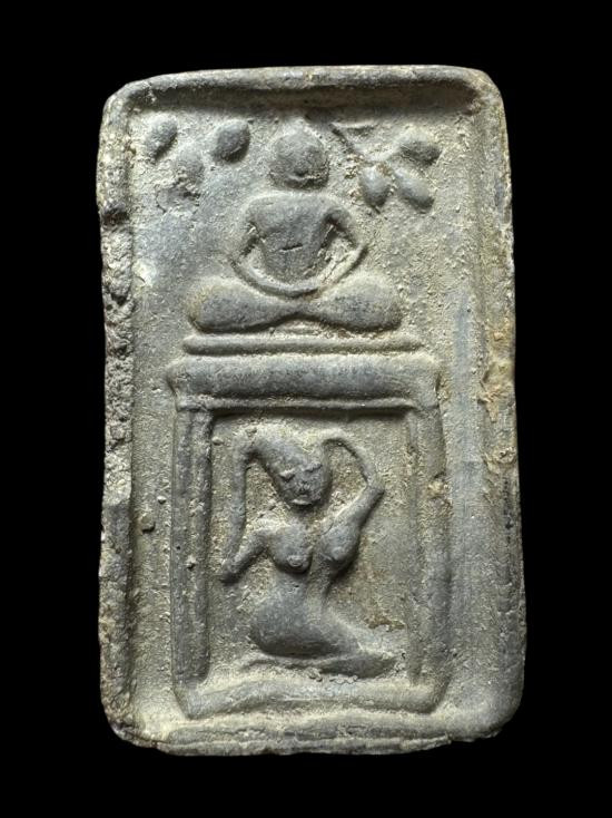 พระเนื้อผงสีดำนั่งบนแม่ธรณีบีบมวยผม หลัง ยันต์เก่ามากค่ะ |