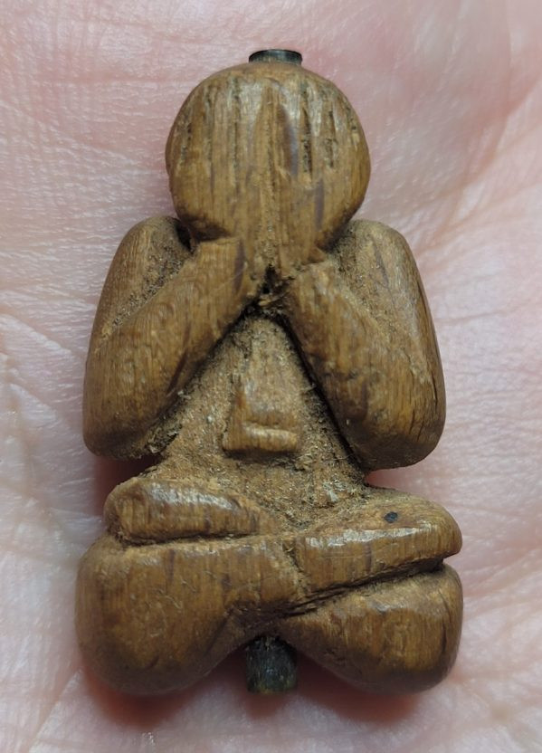 พระปิดตาไม้แกะ เก่า ไม่ทราบที่ มีจรอยจารย์ทั่วองค์ ฝังตะกรุด |