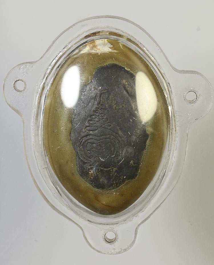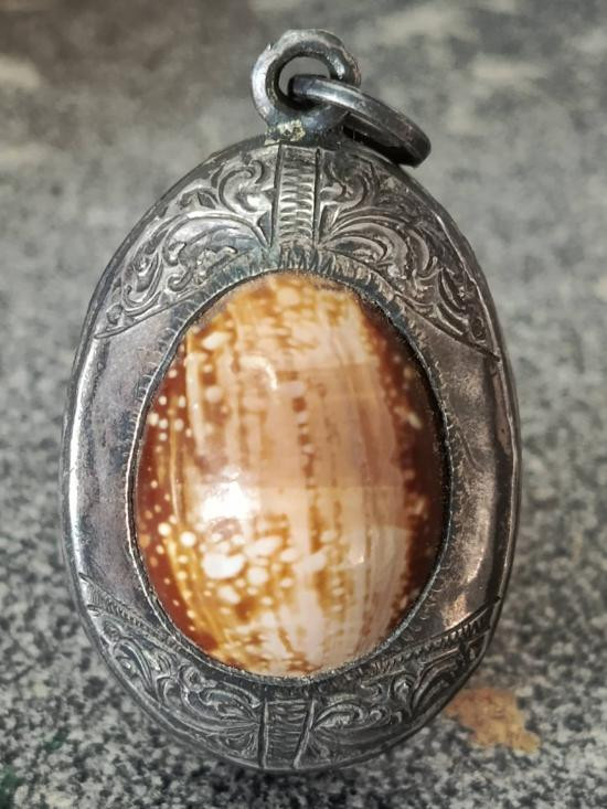 วัดใจ**เครื่องราง เบี้ยแก้หุ้มตะกั่ว*{ มีรอยจาร ปรอทวิ่งอยู่ }*ไม่ทราบที่....ตามสภาพครับ |