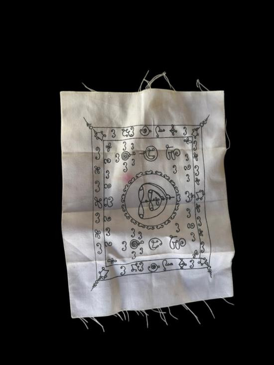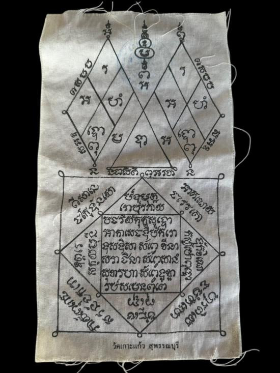 ผ้ายันต์ ไม่ทราบที่ ลวดลายสวย มีตราวัดแต่ผมอ่านไม่ออก ครับ (พระบ้าน ครับ) |