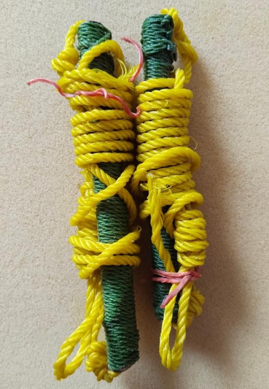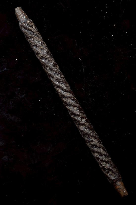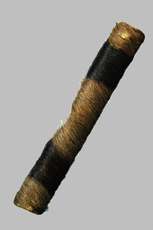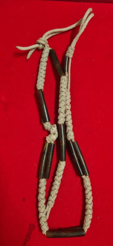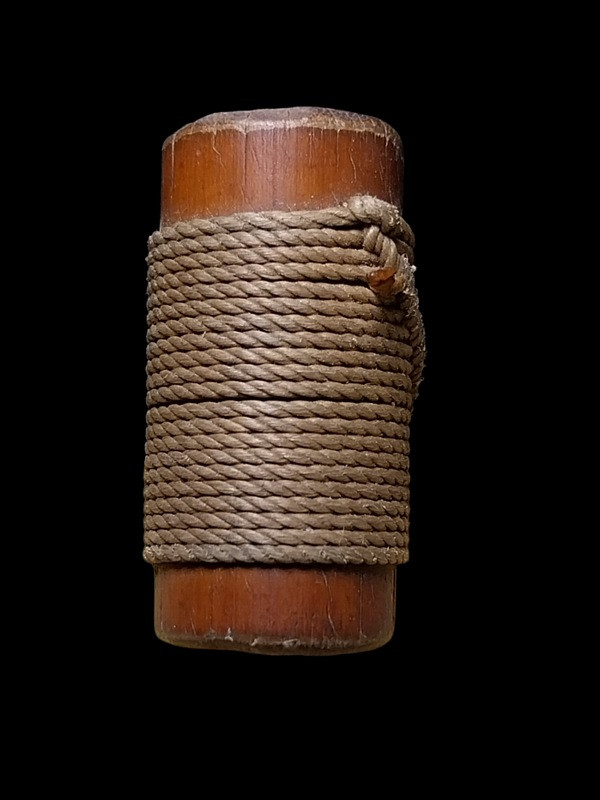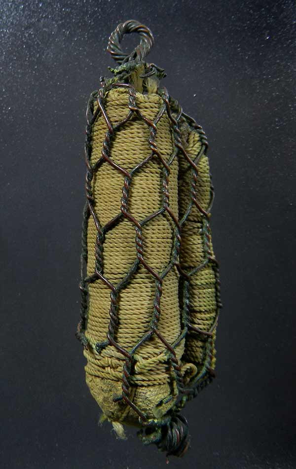 ตะกรุดเปลือย(ไม่ทราบที่)พร้อมเชือกร้อยเก่า เนื้อทองฝาบาตร สภาพเก่ามีอายุ ยาว 2 นิ้ว พร้อมใบตรวจสอบโลหะ