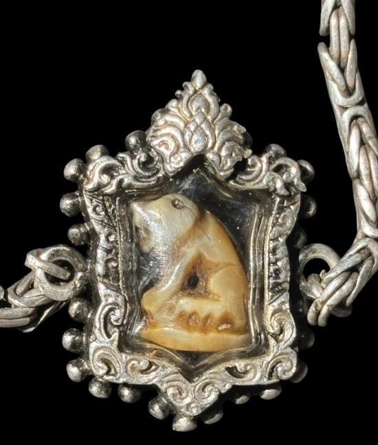เขี้ยวเสือไม่ทราบที่มีรอยจาร มาพร้อมสร้อยข้อมือตลับเงินสั่งทำ มาพร้อมสร้อยข้อมือตลับเงินรมดำเม็ดไข่ปลาข้างเงินสั่งทำ ความยาว 7 นิ้ว |