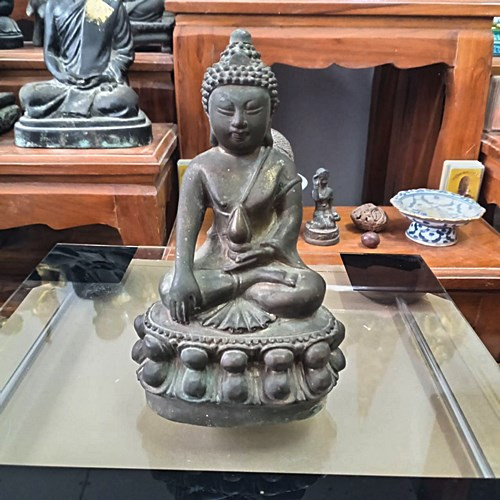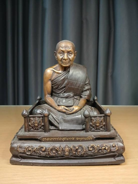 พระบูชา หลวงพ่อสุนทร จันทเถโร วัดหนองสะเดา หนองแค สระบุรี หน้าตัก 5 นิ้ว เนื้อทองเหลืองรมดำ สองถอด ใต้ฐานฝังเหรียญ หมายเลข ๑๑๔ |