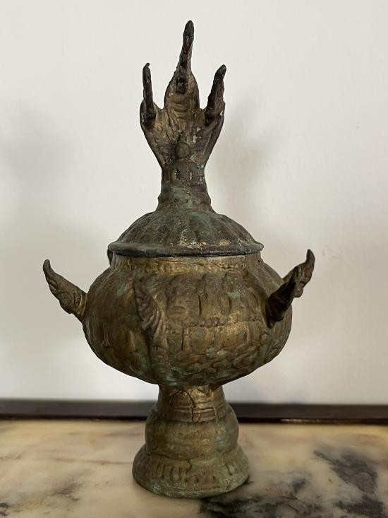 คนโทน้ำพระพุทธมนต์ มีฝาครอบ วัดพระธาตดอยกู่ จ.เชียงใหม่ พ.ศ.2553 เนื้อโลหะรมดำมันปู ใบใหญ่สูงรวมฐาน 19.5 นิ้ว สภาพสวย ขนาดใหญามากๆ !! |