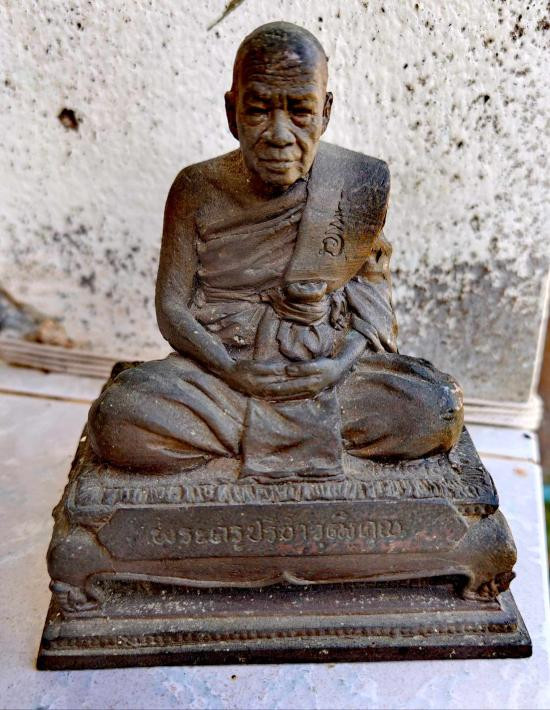 พระรูปเหมือนขนาดบูชา หลวงพ่อหยอด วัดแก้วเจริญ จ.สมุทรสงคราม เนื้อโลหะ ใต้ฐานอุดผงว่านฝังพระ พระบ้าน ผิวหิ้ง |