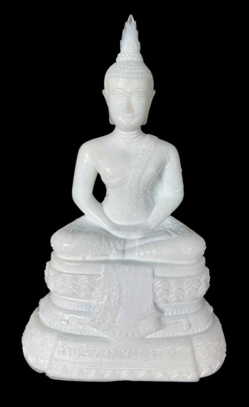 พระแก้วพิธี 25 พุทธศตวรรษ บล็อคทรงพระเจริญ พิธีเสาร์ห้า ก้นปั้มตรายาง สำนักพุทธเทวประทีป เนื้อแก้วสีขาวหยก(บล็อคนี้สีหายากครับ ไม่ค่อยพบเจอครับ) หน้าตัก 5 นิ้ว สภาพสวยสมบูรณ์ครับ |