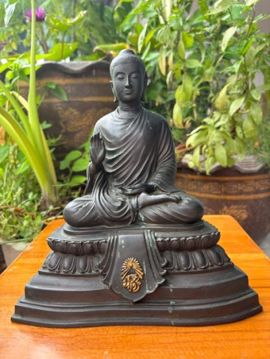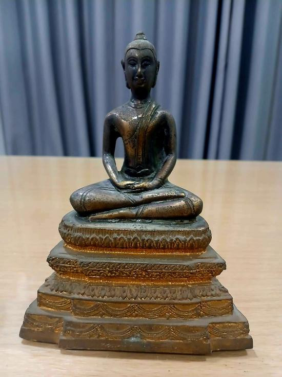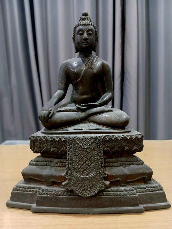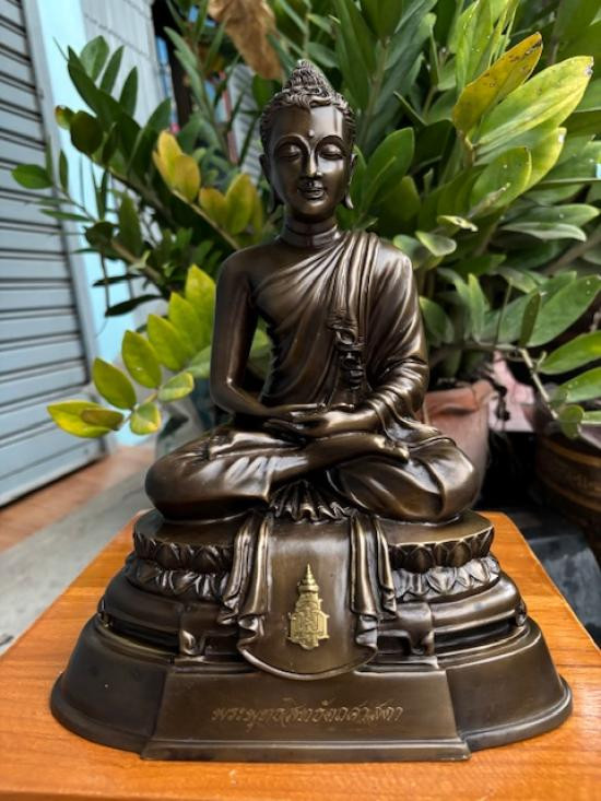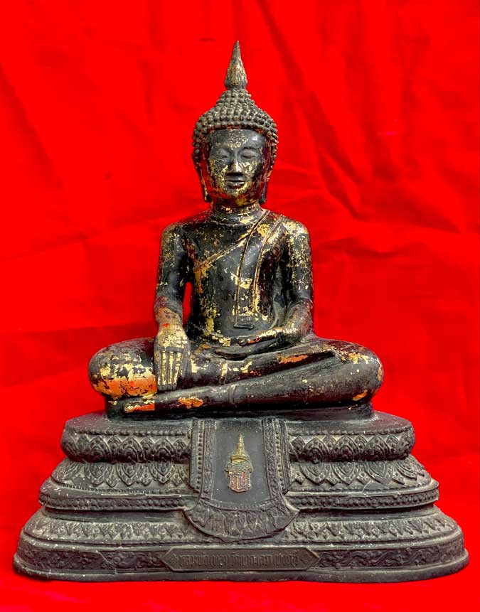 พระบูชาฐาน ภปร. พระกฐินต้น วัดเทวสังฆาราม จ.กาญจนบุรี พ.ศ.25 06 เนื้อโลหะรมดำผิวแห้งหิ้ง หน้าตัก 5 นิ้ว ตอกโค๊ต หัวช้งมีม งกุฎ หล่อดินไทย !! |