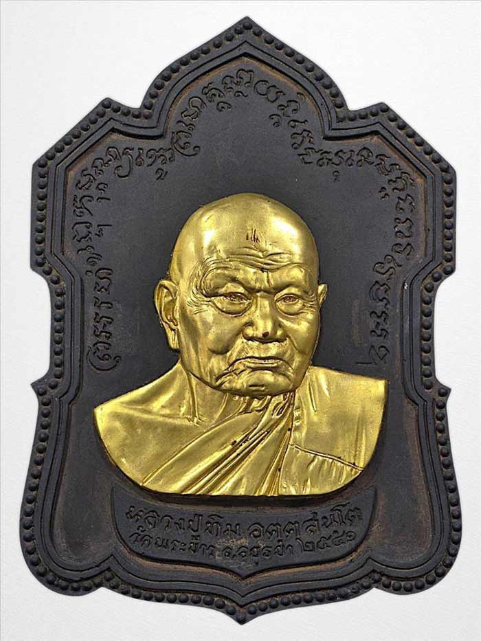 แผ่นโล่ห์รูปเหมือนหลวงปู่ทิม วัดพระขาว จ.อยุธยา พ.ศ.2541 เนื้อโลหะรมมันปู ปิดทองที่องค์พระ ขนาด 6 นิ้ว X 9 นิ้ว ตอกโค๊ต ตอกเลข สภาพสวย !! |