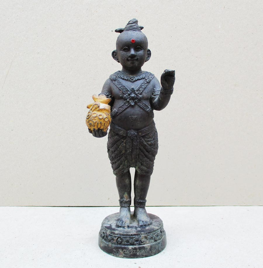 กุมารทอง ขนาดบูชา ยืนอุ้มถุงทอง 1000 ล้าน กวักทรัพย์ หลวงปู่ชื่น ติคญาโณ วัดตาอี จ.บุรีรัมย์ รุ่นรับทรัพย์ พ.ศ.2545 สูงรวมฐาน 7.5 นิ้ว เนื้อโลหะรมดำ ผิวแห้งคาหิ้ง !! |