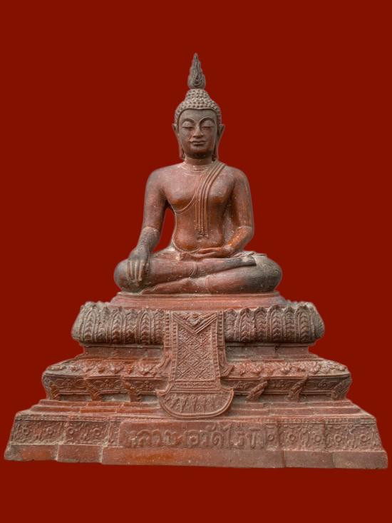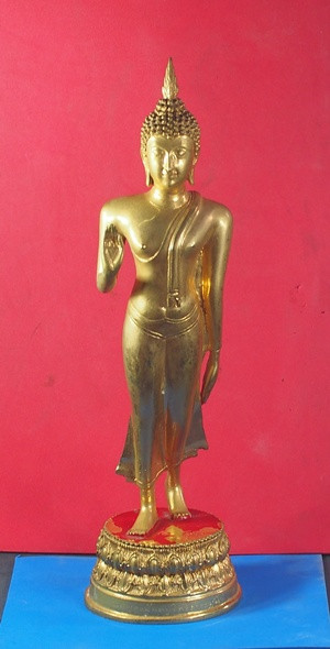 2000 แดง พระบูชาปางลีลา รวมฐาน 4 นิ้ว พระสูง 12 นิ้ว พระพุทธนันทบุรี ศรีศากยมุนี วัดพระธาตุช้างค้ำวรวิหาร จ.น่าน ปี 2523 หมายเลข 0338 ใต้ฐานพระหล่อแบบดินไทย |