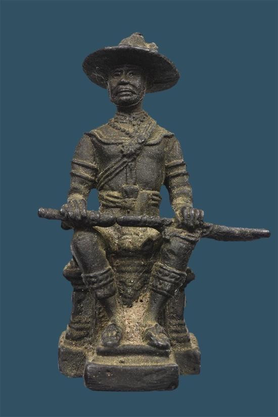 องค์จตุคามรามเทพเนื้อโลหะผสม รมดำ ไม่ทราบที่ ฐานกว้างประมาณ 8 นิ้วสูงประมาณ 14-15 นิ้ว มีเหรียญใต้ฐาน และมีน้ำหนักมาก |