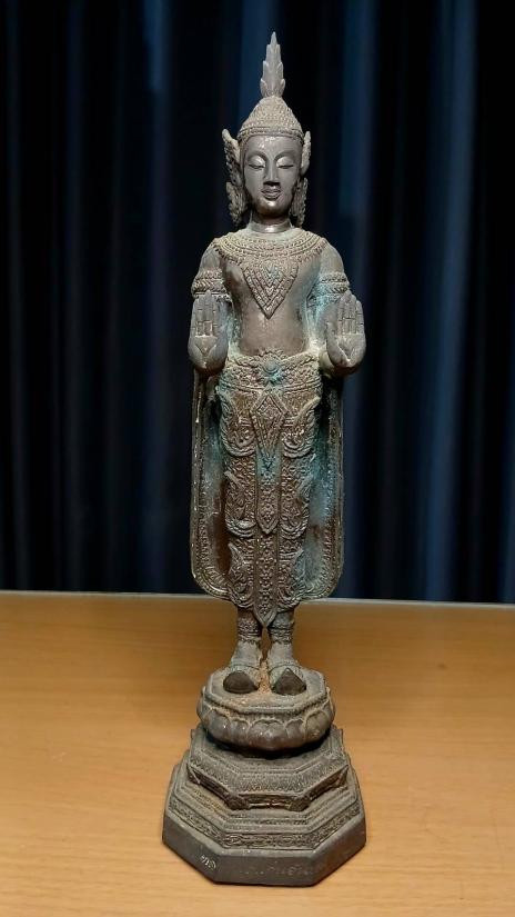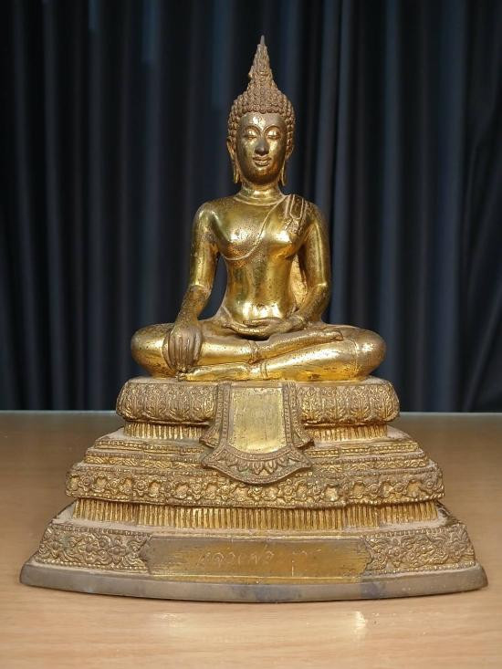 พระสัมพุทธภูธรินทร์ พระบูชารุ่นแรกของกรมตำรวจ ในหลวงรัชกาลที่ 9 เสด็จเททอง พ.ศ.2516 หน้าตัก 5 นิ้ว เนื้อโลหะรมมันปูผิวหิ้ง ดินไทยสีดำ-แดง ตอกโค๊ต ตอกเลข หายากครับ !! |