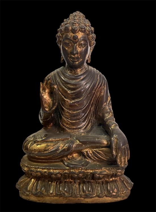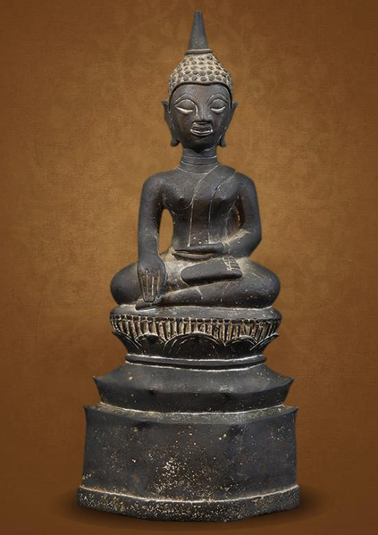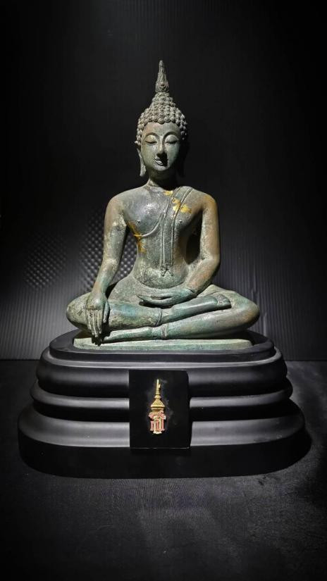 พระพุทธรูปสำริดปางมารวิไชย สมัยเชียงแสนแบบสิงห์๓ ฐานสำเภา (ลงกรุ) อายุราว ศตวรรษที่ 21-23 อายุราว 300-400 ปี ลงรักปิดทองแล้วขัดผิวโบราณ (ผิวขัดเก่า) ผิวหิ้งๆเดิมๆ ไม่มีอุดซ่อม -ขนาดหน้าตัก 3.5 นิ้ |