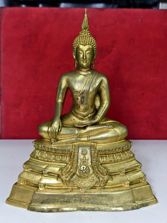 พระบูชาสมัยรัชกาล ปางสมาธิ เนื้อทองแหลือง ก้นดินไทยเดิมๆ หน้าตัก5นิ้ว(วัดจริง4.8นิ้ว) สภาพสวย ใบหน้าอมยิ้มอิ่มความสุข พร้อมบัตรรับรอง |