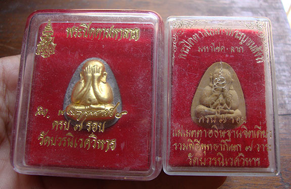 พระปิดตาเนื้อผงจุ่มรักปิดทอง หลวงปู่เหมือน วัดกำแพง จ.ชลบุรีครับ |