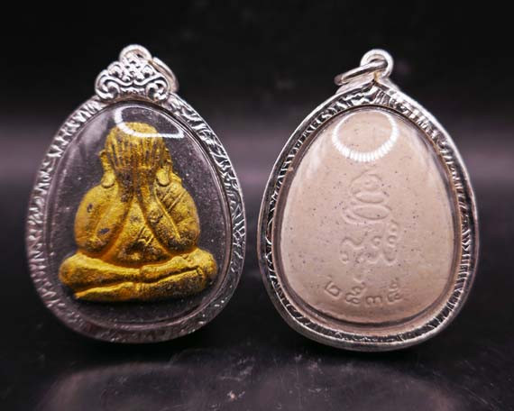 วัดใจ เคาะเดียวพระปิดตาเนื้อทองผสมพร้อมเลี่ยมทรงดอกบัวเก่าพระบ้านไม่ทราบที่เหมามา |