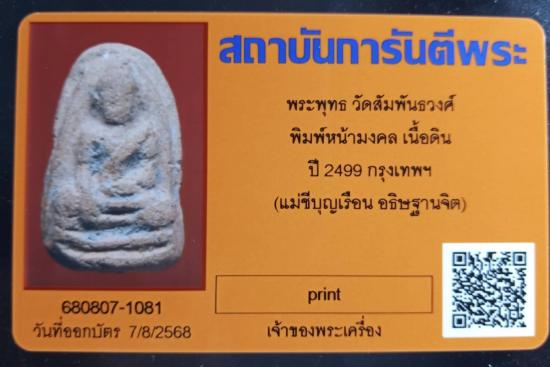 พระพุทธแม่ชีบุญเรือน วัดสัมพันธวงศ์ พิมพ์หน้ามงคล เนื้อดิน ปี 2499 พร้อมบัตรรับรอง ครับ |