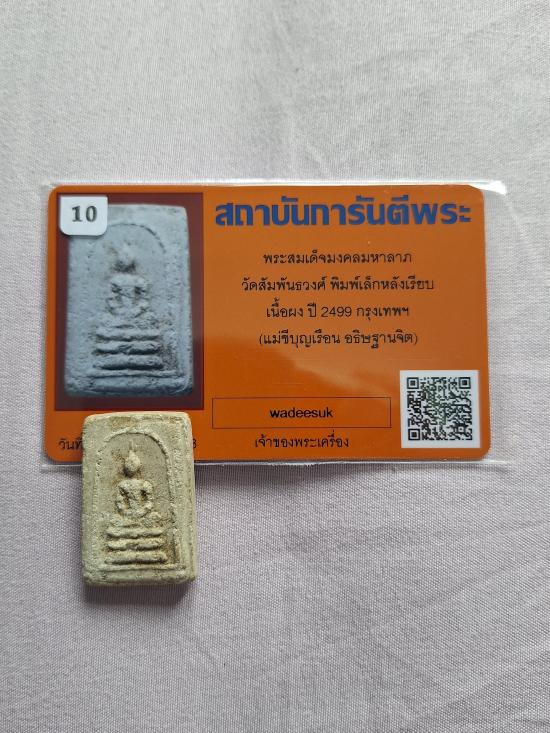 พระสมเด็จมงคลมหาลาภ วัดสัมพันธวงศ์ พิมพ์เล็กหลังเรียบ เนื้อผง ปี 2499 กรุงเทพฯ (แม่ชีบุญเรือน อธิษฐานจิต) |