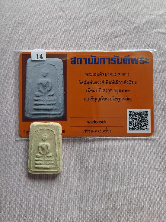 พระสมเด็จมงคลมหาลาภ วัดสัมพันธวงศ์ พิมพ์เล็กหลังเรียบ เนื้อผง ปี 2499 กรุงเทพฯ (แม่ชีบุญเรือน อธิษฐานจิต) |