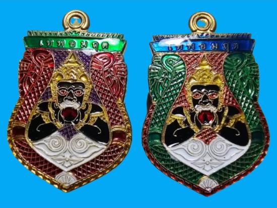 รับ 2 เหรียญ เหรียญพระราหูอมจันทร์ หลวงปู่ศิลา เมตตาอธิษฐานจิต รุ่นเหนือดวง เนื้อทองฝาบาตรลงยา |