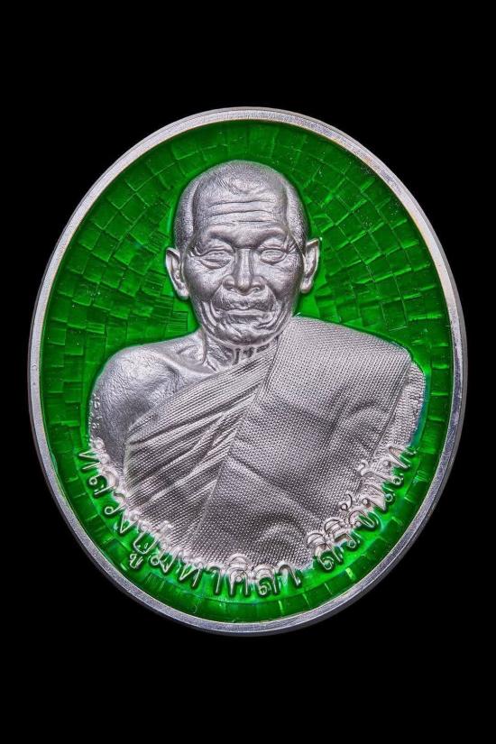 หลวงปู่มหาศิลา หลวงปู่ศิลา รุ่นอายุวัฒนมงคล พิมรุ่นแรก2 เนื้อเงินลงยาสีเขียว ซีลเดิม#1