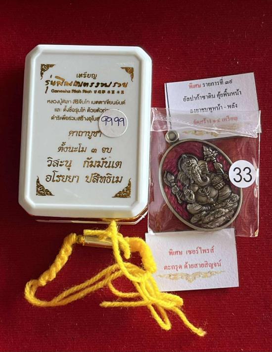 เหรียญพระพิฆเนศ รุ่น"พิณเณตร รวย รวย" หลวงปู่มหาศิลา เมตตาเขียนยันต์และตั้งชื่อให้ด้วยตัวท่านเองครับ ออกในงานที่ระลึกสร้างอุโบสถมหาอุตม์ วัดบ้านโนนเดื่อ จ.ร้อยเอ็ด เหรียญพร้อมตะกรุด ด้ายสายสิญจ์ เลข 9999 |