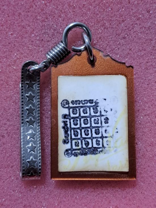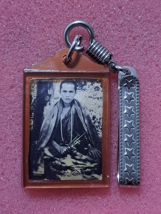 รูปถ่ายหน้าหนุ่มถือตรี หลังปั๊มยันต์ ประมาณปี38 มีตอกโค๊ต กระดาษหนังฟิมล์สีอมม่วง เลี่ยมวิลเทจสวยเดิมครับ |