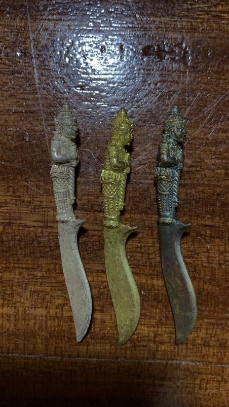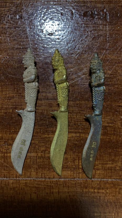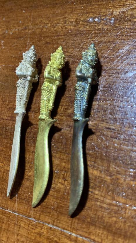 มีดท้าวเวสสุวัน สามเล่ม เนื้อชนวนรุ่ง เนื้อชนวนทอง เนื้อชนวนสำริดเงิน หลวงปู่ณรงค์ สาโม วัดมงนิมิตมหาสารคาม |