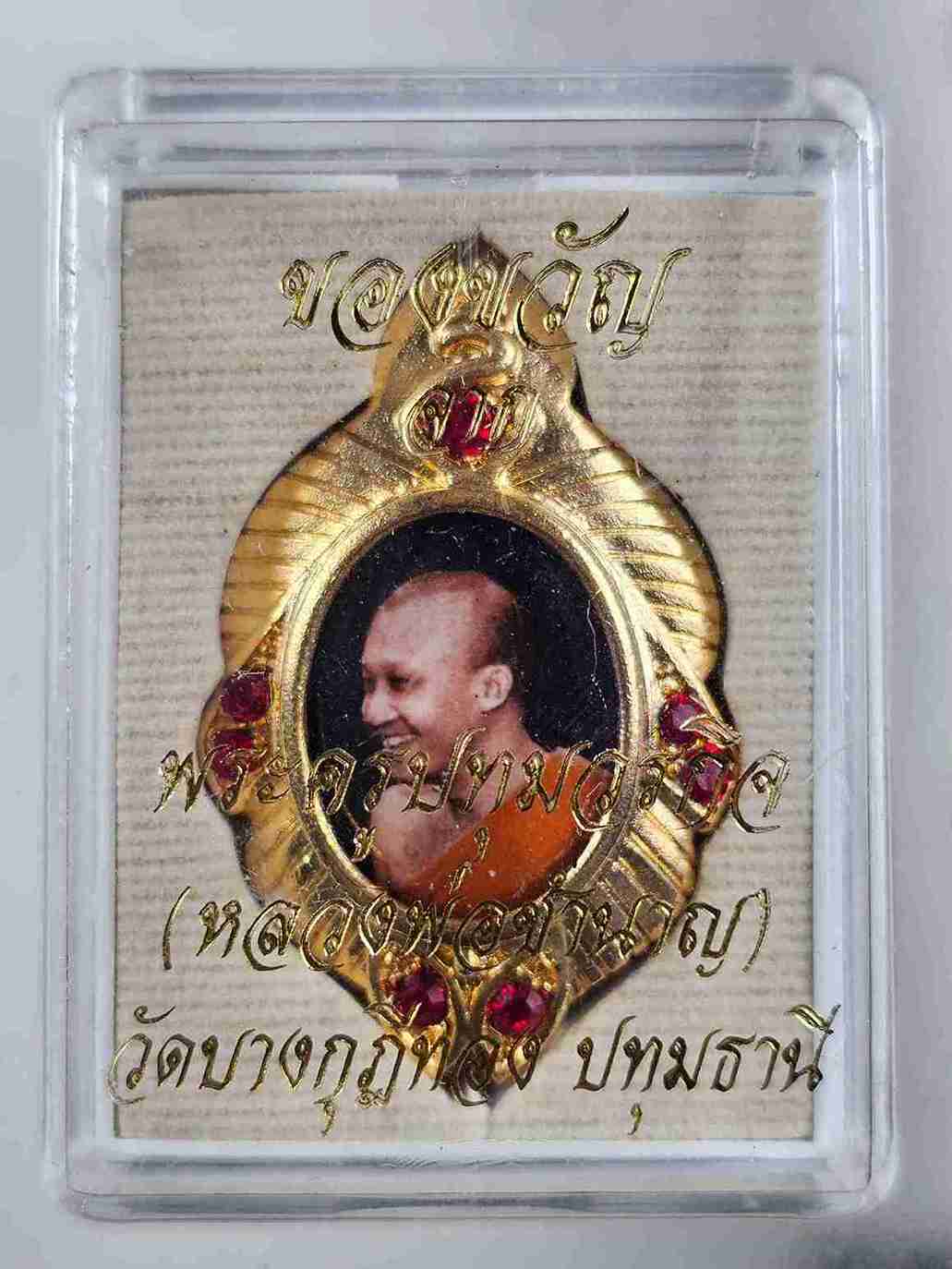 เข็มกลัดล็อกเก็ตของขวัญ หลวงพ่อชำนาญ วัดบางกุฎีทอง ปทุมธานี ปี 2558 เนื้อโลหะชุบทองฝังพลอย |