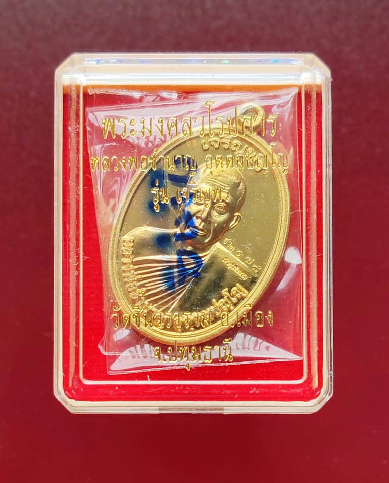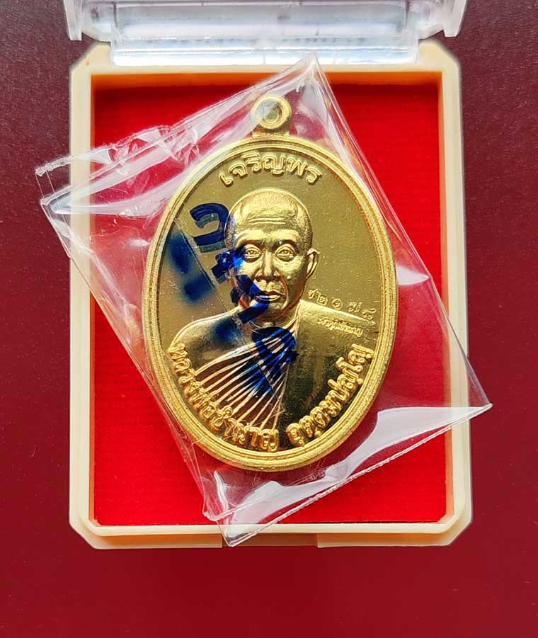 เหรียญเจริญพร รุ่นแรก หลวงพ่อชำนาญ วัดชินวราราม จ.ปทุมธานี พิมพ์เครึ่งองค์ หลังพระพรหม (นิยม) เนื้อทองทิพย์(ผิวกระจก) ปี'58 ผิวเดิม ในซีลเดิม นอนกล่องเดิม หมายเลข2178