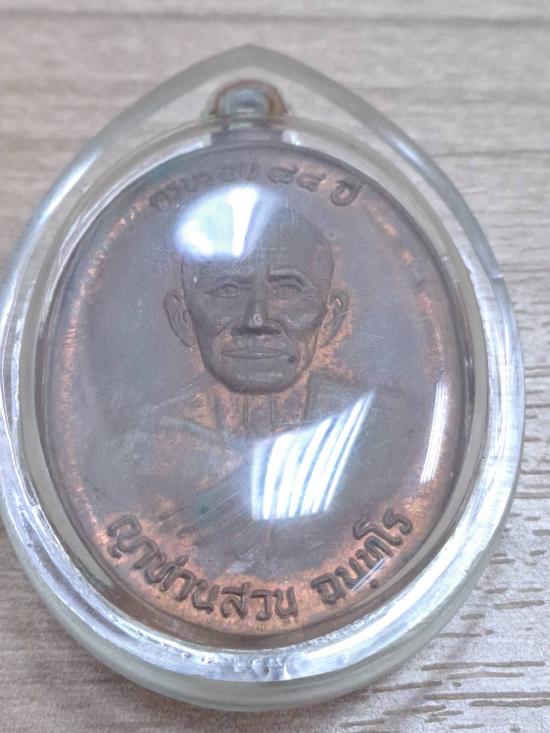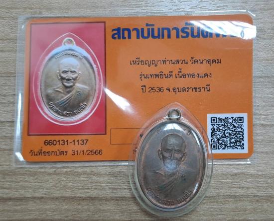 เหรียญญาท่านสวน วัดนาอุดม รุ่นเทพยินดี เนื้อทองแดง ปี 2536 จ.อุบลราชธานี พร้อมบัตร G