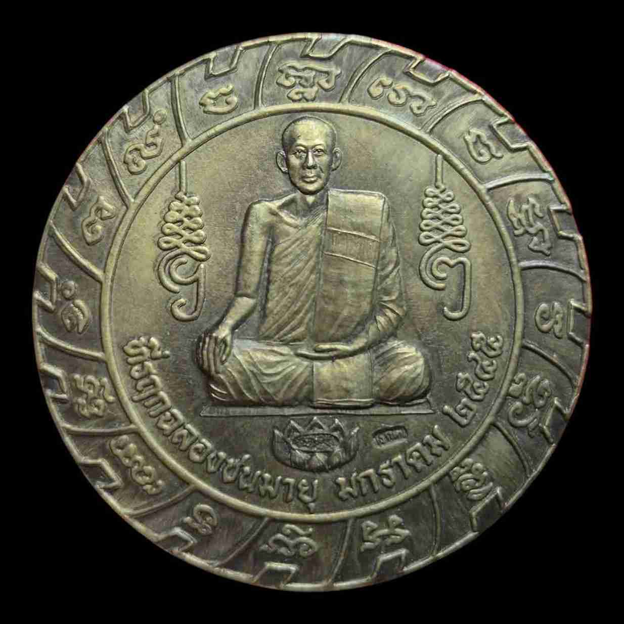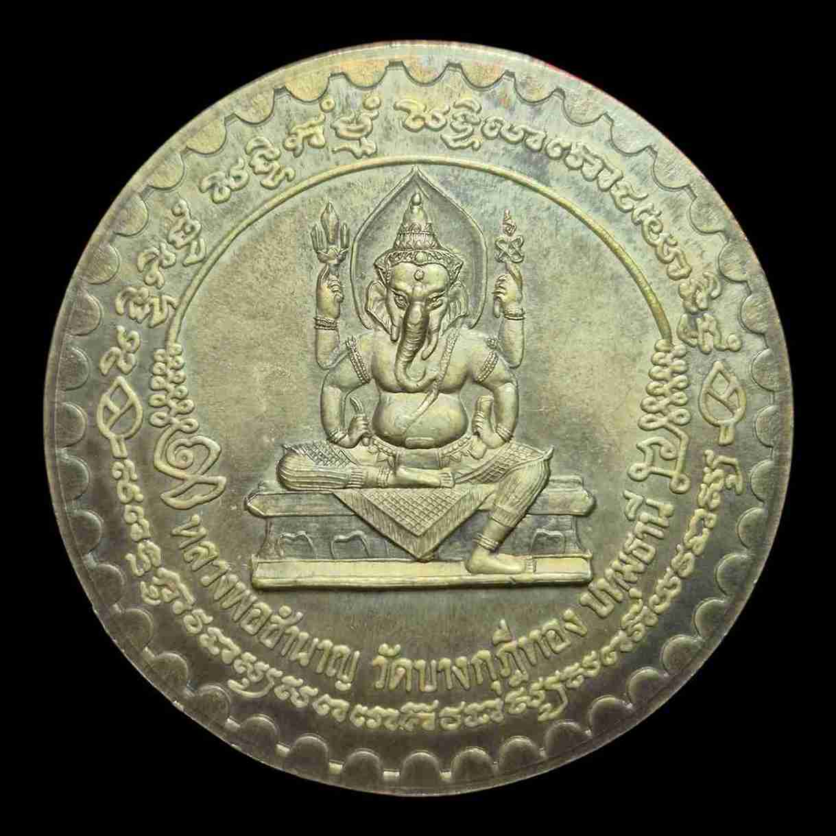 เหรียญหลวงพ่อชำนาญ วัดบางกุฎีทอง จ.ปทุมธานี หลังพระพิฆเนศ ที่รฤกฉลองชนมายุ เนื้อทองเหลือง ปี 2545 |
