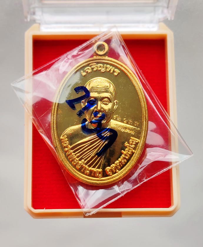เหรียญเจริญพร รุ่นแรก หลวงพ่อชำนาญ วัดชินวราราม จ.ปทุมธานี พิมพ์เครึ่งองค์ หลังพระพรหม(นิยม) เนื้อทองทิพย์-ผิวกระจก ปี'58 ผิวเดิม ในซีลเดิม นอนกล่องเดิม หมายเลข2139