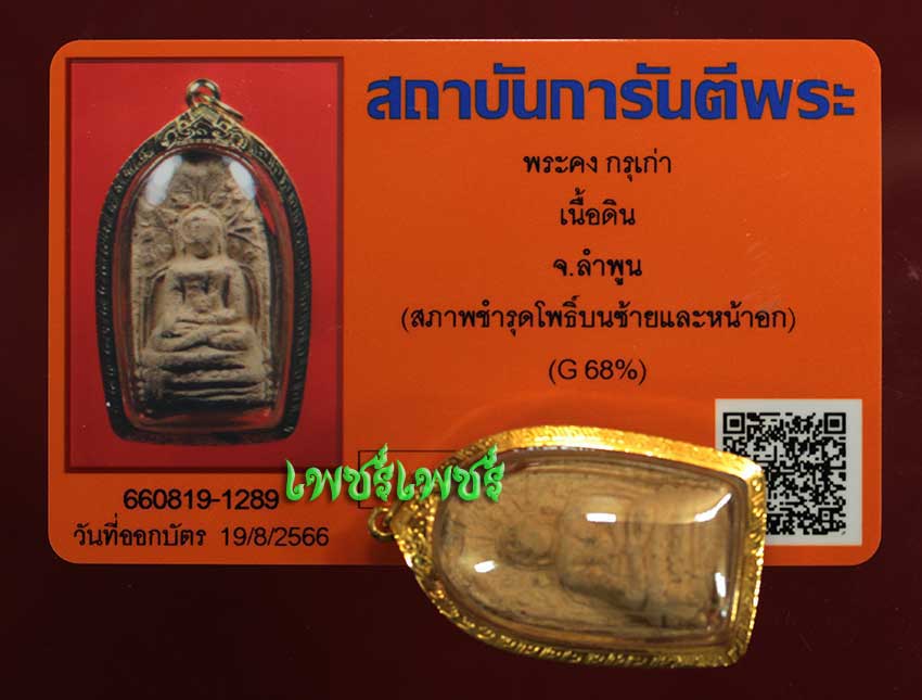 พระคง กรุเก่า เนื้อดิน จ.ลำพูน สภาพชำรุดโพธิ์บนซ้ายและหน้าอก แต่สวยคมชัด เลี่ยมทอง68% พร้อมบัตรรับรองพระแท้จากการันตีพระสบายใจได้พระแท้แน่นอน ค่ะ