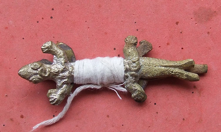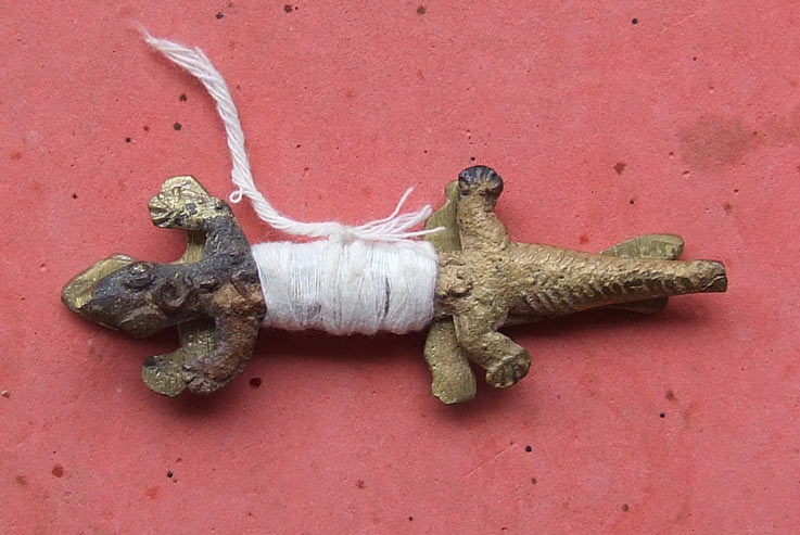 จิ้งจก หลวงพ่อชู วัดหนองโรง จ.กาญจนบุรี เนื้อทองผสม หล่อโบราณ แบบเป็นคู่ ตัวผู้ - ตัวเมีย จิ้งจกตัวผู้มีหางเดียว ใช้ทางด้านมหาเสน่ห์ จิ้งจกตัวเมีย มี สองหาง ใช้ทางด้านโชคลาภ ทำมาค้าขาย ดีนัก. |