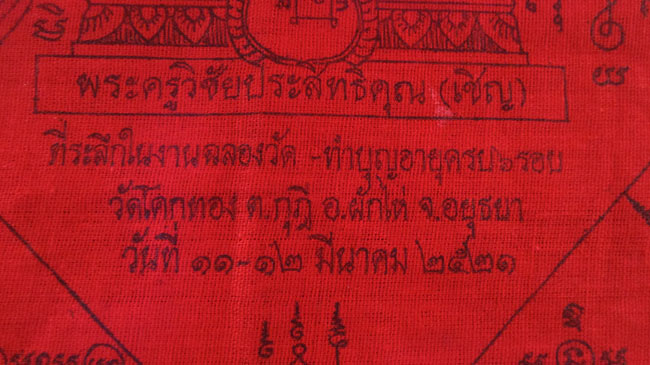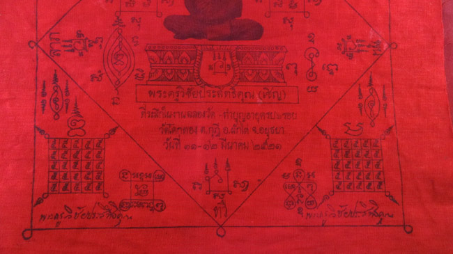 ผ้ายันต์ พระครูวิชัยประสิทธิ์คุณ (เชิญ) วัดโคกทอง ต.กุฎี อ.ผักไห่ จ.อยุธยา วันที่ ๑๑-๑๒ มีนาคม ๒๕๒๑ ครับ (พระบ้าน ครับ) |