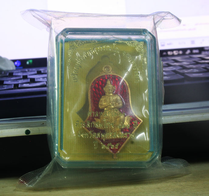เหรียญท้าวเวสสุวรรณ รุ่น สมโภช 121 ปี เนื้อมหาชนวนกาหลั่ยทองลงยาสีแดง หน้าหลัง กล่องเดิม ซีลเดิม ยังไม่แกะ