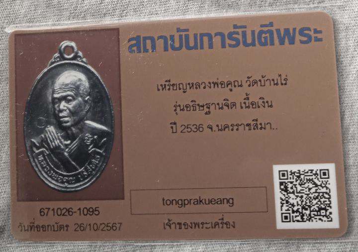 ลพ.คูณ วัดบ้านไร่ จ.นครราชสีมา รุ่นอธิฐานจัตร เนื้อเงิน ปี2536.,พร้อมบัตรจัพระฯ.