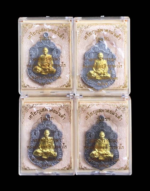 +!!เคาะเดียวllดง ตลอดสาย!!+ (ชุด 4 เหรียญ) เหรียญเสมาคอน้ำเต้า รุ่นแรก หลวงปู่ฉิมพะลี วัดวิชัยร่วมมิตร จ.เลย ปี62 (เนื้อตะกั่ว หน้ากากทองฝาบาตร เลขสวย 12/21/61/233) พร้อมกล่องเดิมครับ |