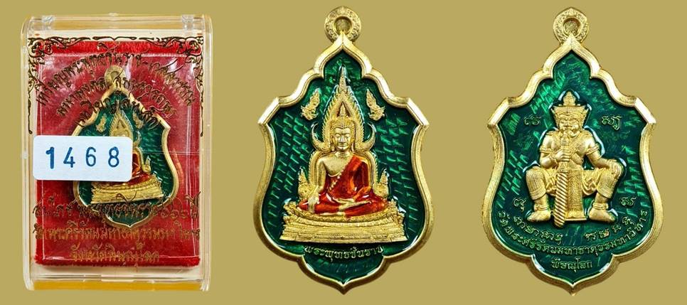 ( เลข 1468 ) เหรียญโล่ห์พระพุทธชินราช หลังยันต์วิเศษอกเลาโภคทรัพย์ เนื้อทองทิพย์ลงยาสีเขียว เหนี่ยวทรัพย์ รุ่น สมโภชพระพุทธชินราช ครบ ๖๖๖ ปี |